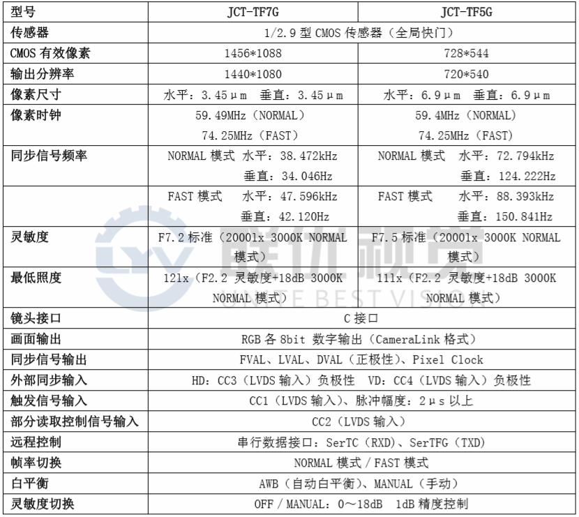 產(chǎn)品簡介●高速型:JCT-TF5G(720*540、150 幀)●搭載 1/2.9”逐行掃描 3CMOS 傳感器 ?●CameraLink/PoCL 模式 ●外部觸發(fā)功能(單次脈沖觸發(fā)、寬幅脈沖觸發(fā)) ●部分讀取功能(TF5G:1 個位置、TF7G:4 個位置)●抖動修正功能 ●自動快門功能