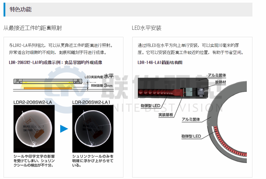 LED垂直地安裝在線形基板上。環(huán)形排列的LED彼此水平相對地照明。薄型設(shè)計,厚度為10mm??梢员M可能靠近工件使用。