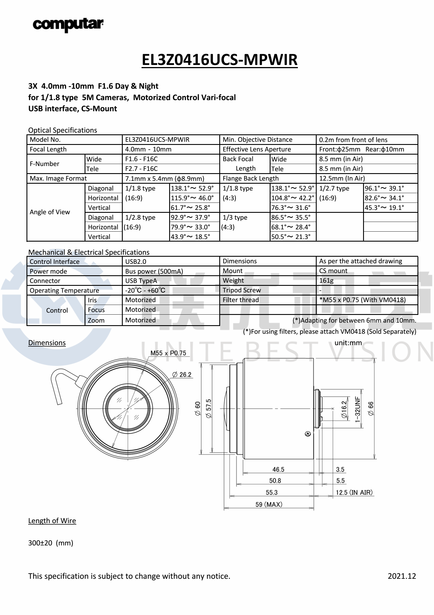 • 全新電動鏡頭,可通過 USB 供電和控制(適用于 I2C 版本)