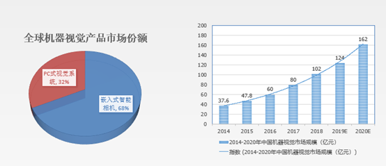 機器視覺系統(tǒng)通常分為基于PC的視覺系統(tǒng)(工業(yè)相機+工業(yè)電腦)和基于嵌入式智能相機(智能相機)的視覺系統(tǒng)。嵌入式智能相機系統(tǒng)(智能相機)憑借體積小,安裝方便,穩(wěn)定性好等優(yōu)勢占據(jù)了較大的市場份額。